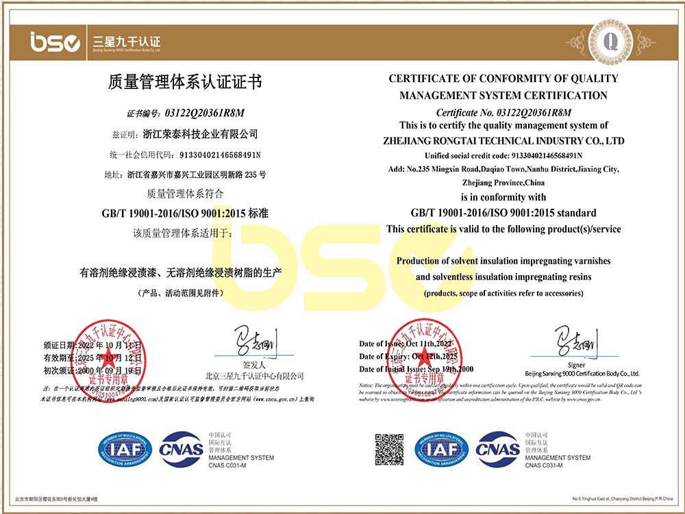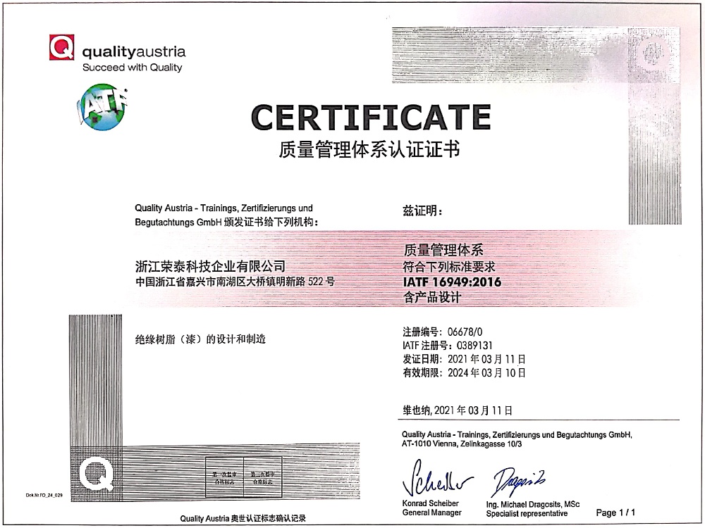 浙江荣泰科技企业有限公司为专业生产高性能绝缘材料的国家高新技术企业、国家“小巨人”企业,为国内最大的绝缘漆生产商,全国绝缘材料行业协会的副理事长单位,规模、产品技术和创新能力处于同行业领先地位。