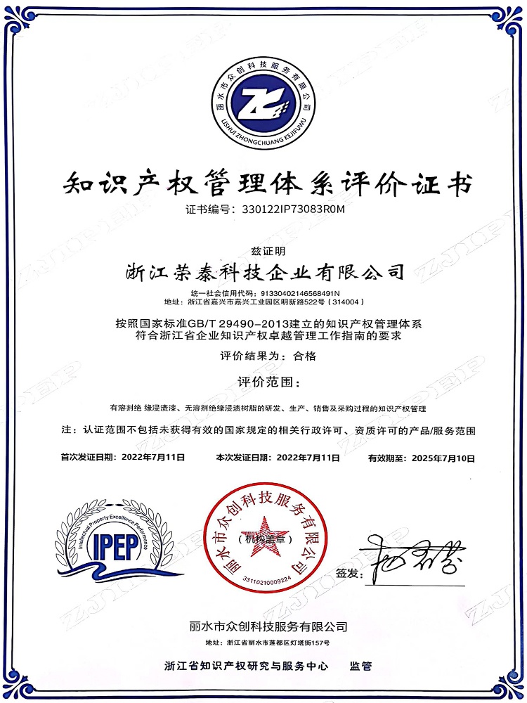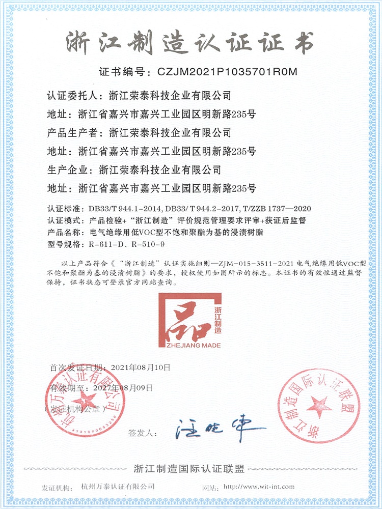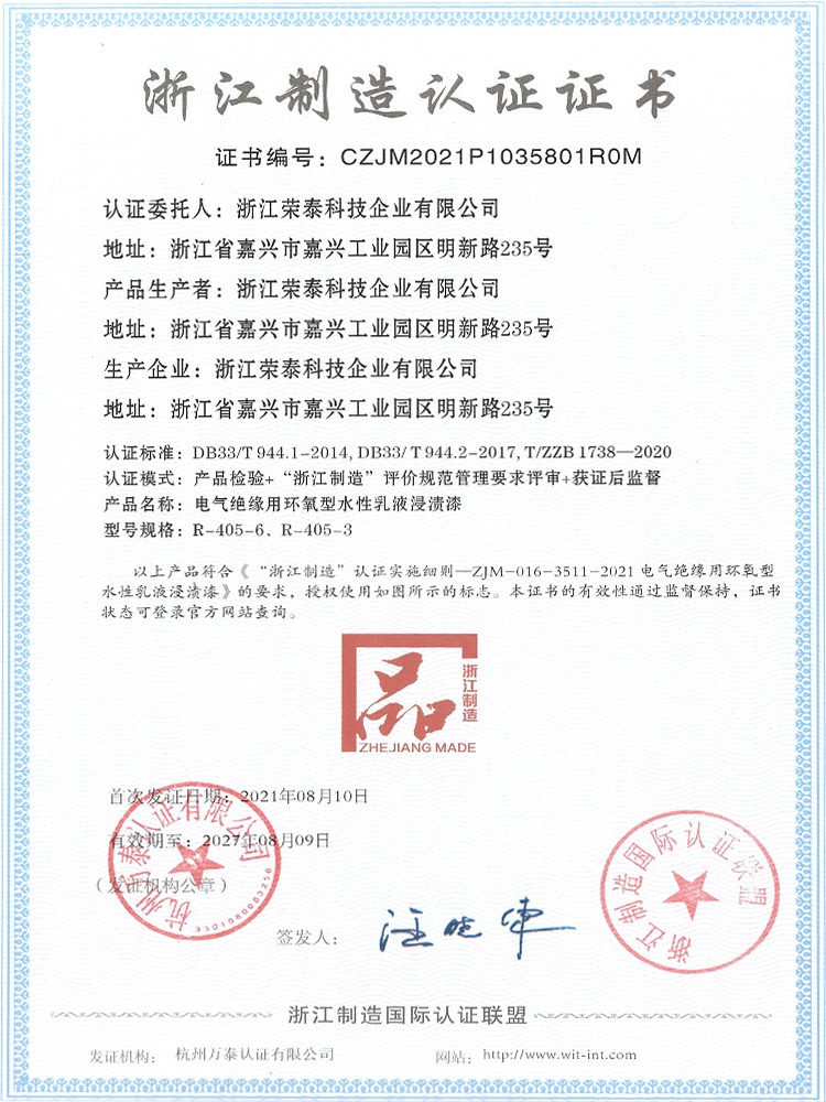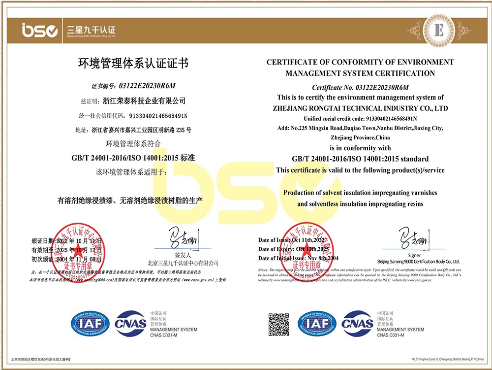 浙江荣泰科技企业有限公司为专业生产高性能绝缘材料的国家高新技术企业、国家“小巨人”企业,为国内最大的绝缘漆生产商,全国绝缘材料行业协会的副理事长单位,规模、产品技术和创新能力处于同行业领先地位。